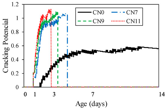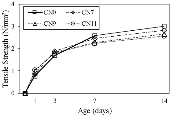Figure 14 shows the restrained tensile stress calculated by Equation (1), which tended to increase with the restraint shrinkage strain. The maximum restrained tensile stress was 1.8 N/mm2 for CN11, 1.9 N/mm2 for CN9, and 2.1 N/mm2 for CN7, and cracking occurred after reaching the maximum tensile stress. The restrained tensile stress increased with the amount of CN added because of the increase in the stress generated in the inner steel ring. This was confirmed to accelerate the crack occurrence in the mortar. It is considered that the stress relaxation was reduced by the tensile creep. On the other hand, the cracking potential is calculated from the ratio of restrained tensile stress to tensile strength. Figure 15 shows the change in tensile strength over time, and Figure 16 shows the crack potential in each case. The tensile strength was calculated by Equation (2) using the result from the compressive strength [26]: