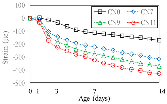 Figure 17 shows the changes in the drying shrinkage strain over time. On Day 1, after the start of drying shrinkage, the drying shrinkage strain was 1.5 μ for CN0, 10.5 μ for CN7, 29 μ for CN9, and 36 μ for CN11, indicating that the drying shrinkage tended to increase with the amount of CN added. On Day 14, after the start of drying shrinkage, the drying shrinkage strain was 170 μ for CN0, 315 μ for CN7, 372 μ for CN9, and 430 μ for CN11, indicating that the drying shrinkage on Day 1 tended to increase with the amount of CN added, and became more pronounced. These results confirm that drying shrinkage increases with the amount of CN added, and agree with the restrained shrinkage results; moreover, when a considerable amount of CN was added, restrained shrinkage was considered to increase with drying shrinkage.