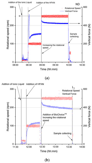 Compounding procedure, rotational speed and dwell time of the (a) PAN/IL dopes (ND) and (b) PAN/lignin/IL (PAN/lignin = 2:1) (L1) and the impact of the added lignin on the vertical force of the compounding screws. HPAN, homo-polyacrylonitrile.