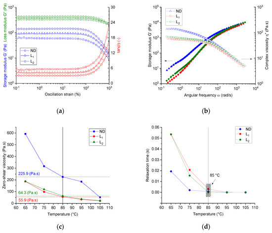 To identify the spinning dopes for being linear or non-linear viscoelastic, the strain dependency of both the storage moduli (G′) and loss moduli (G″) was evaluated at a constant frequency and two different temperatures (85 °C and 105 °C). Additionally, the yield stresses of the spinning dopes were estimated for the studied dopes under the same conditions.