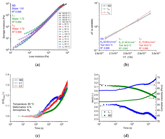 The TTS was evaluated from the logarithmic value of the horizontal shift factors αT of the storage modulus at 85 °C versus the term 1/T. If there was no break in the TTS plot, the system was considered miscible and the activation energy of the flow was calculated from the slope of the linear regression of the TTS plot using the Arrhenius model.