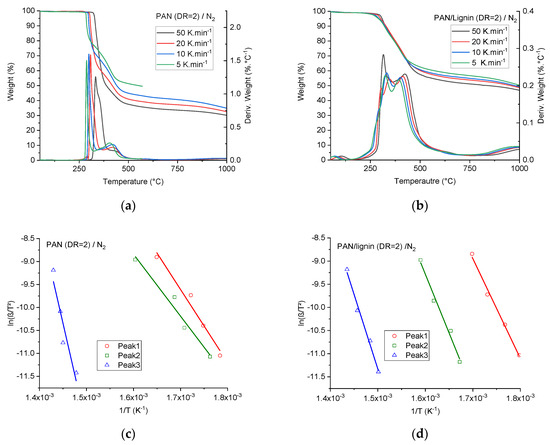 Under nitrogen (Figure 10a), neat PAN fibers showed single and sharp exothermal peaks of the conversion reaction of nitrile groups to imine groups. This peak shifted to higher temperatures by increasing the heating rate. Introducing lignin to the fibers (Figure 10b) resulted in the overall reduction of the released heat during the exothermal conversion reaction of nitrile groups to imine groups. An additional associated exothermal shoulder was also detected, suggesting exothermal crosslinking reactions induced by lignin. Furthermore, the onset and peak temperatures in the case of lignin-containing fibers shifted (compared with the neat PAN fibers) to lower temperatures by ~10 K for heating rates between 5 and 10 K·min−1 and by ~7 K for heating rates between 1 and 2 K·min−1.