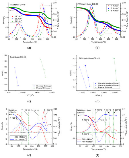 In the case of lignin-containing fibers, however, the onset of glass transition was found at 163 °C and ended at 240 °C with a shift to the left side by roughly ~10 K compared with the neat PAN fibers under the same higher specific tension load. Additionally, the higher load remarkably reduced the peak maximum of the physical shrinkage (obtained from the first derivative of the strain) from 146 °C to 139 °C, as seen from Figure 9f. The chemical shrinkage of phase I occurred at a constant temperature at 266 °C for different loads and the first derivative of the strain versus the temperature was negative, meaning that shrinkage took place. The chemical shrinkage of phase II (lignin-induced) was also at 297 °C in both cases. Remarkably, at this temperature positive, values of the first derivative of the strain versus the temperature were recorded, which means that the fibers at this load level started to be stretched again. This could be initiated by the low molecular volatiles being gassed off by lignin molecules during the early pyrolysis stage (starting from 290 °C, as recorded by the TGA curves). These findings suggest for the future work a detailed evaluation of the activation energies of the physical and chemical shrinkage of the fibers at different specific tension loads and higher drawing ratios.