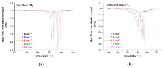 Figure 10 illustrates the DSC measurements of different heating rates for neat PAN fibers and PAN/lignin fibers conducted under air or nitrogen atmosphere at different heating rates. The measurements were conducted in order to reveal the influence of both oxygen (oxidative air atmosphere) and softwood lignin on the stabilization behavior of the developed fibers.