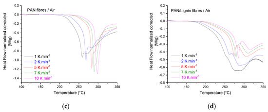 Neat PAN fibers showed, under oxidative atmosphere (air, Figure 10c), an additional exothermal oxidation shoulder followed by a subsequent exothermal crosslinking reaction peak. Increasing the heating rate reduced the FWHM of the oxidation and crosslinking shoulders and shifted the peaks to higher temperatures. In comparison with the neat fibers stabilized under nitrogen, the peak maxima of the conversion reactions of nitrile groups to imine groups were very slightly shifted to lower temperatures (Figure 10a,c). The addition of lignin reduced the overall released exothermal heat compared with that of neat PAN under the same conditions, suggesting that lignin oligomers actively acted as a stabilizer for the stabilization process.