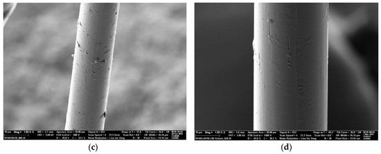SEM images (Figure 11c,d) of the fiber surfaces showed, in both cases (PAN and PAN/lignin fibers), smooth and homogenous surface with longitudinal grooves caused by the flow lines in the nozzle during the extrusion process. Neither pores over the cross section of the fibers could be detected nor did a lobulated surface occur, suggesting a controllable and homogeneous coagulation process.
