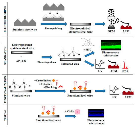 This work aimed to optimize surface pre-treatment and the subsequent silanization of SS wires via electrodeposition. After being covered with APTES, the SS wires were further functionalized with a cross-linker and aptamers against BCSC biomarkers and tested to capture the target cells, BCSC. The surface and the in vitro BCSC capture were characterized using several surface characterization methods. The overall scheme of the work undertaken in this study is shown in Figure 1. The work consisted of several stages: electropolishing of the wire, optimization of silanization through electrodeposition, functionalization of the surface with aptamers, and testing it to capture target cells. After each of the surface modifications, the surface was analyzed by surface characterization techniques, as shown in Figure 1.