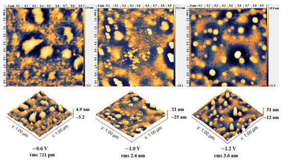 AFM micrographs of electropolished SS wires after electrodeposition of APTES under different potentials; 1 µm × 1 µm images and their 3D images and rms are shown. Samples at −0.8 V are shown in Figure 4, and the 1 µm × 1 µm images for each applied potential and their 3D images are shown.