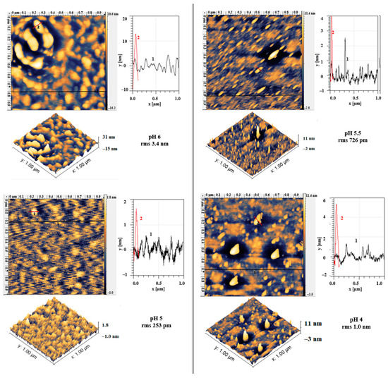 AFM micrographs of electropolished SS wires after electrodeposition of APTES at the applied potential of −0.8 V for 30 min in solutions with pH values of 6; 5.5; 5, and 4. For each pH value, 1 µm × 1 µm images, their 3D images and profiles along the lines are shown.