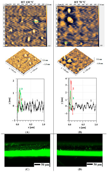 Heat treatment after silanization is another important parameter to consider since it affects the covalent bond forming between APTES molecule and the surface. Two heat treatment temperatures (70 °C [4] and 130 °C [27]) were tested for HT after electrodeposition (Figure 6A,B) taken as the lowest and the highest reported in the literature. As a result, it was observed that at 130 °C, a more uniform layer was formed, while for 70 °C, some larger particles (up to 4.5 nm) were seen. Additionally, FITC analysis of samples after silanization and subsequent heat treatment at two different temperatures showed that at 130 °C the surface had a more uniform and higher signal for FITC than that of 70 °C (Figure 6C,D).