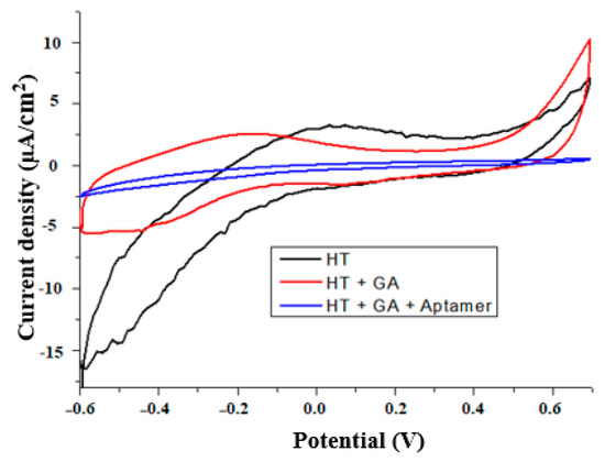 Cyclic voltammograms of silanized SS electrode (HT) after treatment with GA and aptamers. Potential vs. RE (3 M NaCl).