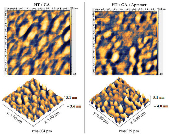 AFM micrographs of cross-linked SS after silanization (HT + GA) and after treatment with aptamers (HT + GA + aptamer).