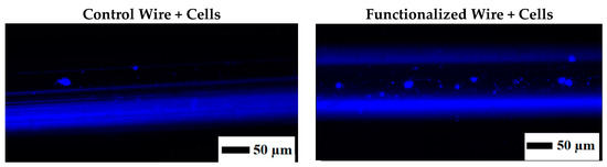 After being fully functionalized, the wires (together with a control wire) were tested to capture target cells. For this, BCSC were chosen as target cells given their importance in breast cancer. Well-characterized cells from patients with triple-negative breast cancer with a number of biomarkers and characteristics pertaining to BCSC were chosen in this study. This includes surface biomarkers such as CD133, CD44, SSEA3/4, Oct4, and important enzymes (alkaline phosphatase, aldehyde dehydrogenase, and telomerase) and tumorigenicity of less than 1000 cells. SS samples were incubated with the cells dissociated with PBS/EDTA. Using non-enzymatic cell dissociation was important for retaining cell surface proteins for further binding to the aptamers [56]. Figure 10 shows the results of fluorescence imaging after incubation with the cells. The functionalized wire was able to capture cells on the surface, as seen from blue-stained nuclei, while the control wire had a very low number of cells as compared to the functionalized wire. Performing this test was important to show that wires made of biocompatible material can capture specific target cells of interest. To further exploit the potential of the aptamer-functionalized wires for in vivo applications, this in vitro study should be replicated in a model that mimics blood flow (e.g., vein diameter, blood flow, and more complex media containing other cells and proteins). In the future, the functionalized wire also needs to be tested using control cells with no or low expression of CD44 biomarkers (such as breast epithelial cells) and tested with different cell concentrations.