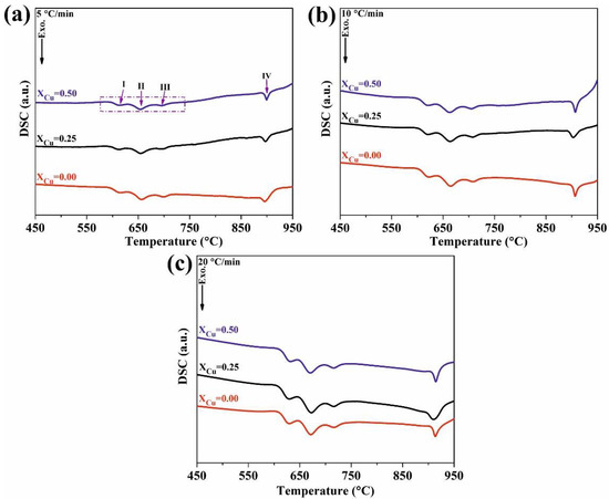 Differential scanning calorimetry (DSC) curves of the investigated bulk metallic glasses (BMGs) at heating rates of (a) 5 °C/min; (b) 10 °C/min; (c) 20 °C/min.