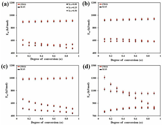 Local activation energy (Eα) describes the dependence of the activation energy on degree of conversion (α). Therefore, to estimate the activation energy at any degree of conversion is very important for the crystallization proceeding. This can clarify the nucleation and growth activation energies required for nonisothermal crystallization. In other words, the local activation energy can be used to determine whether the reaction is single-step or multistep. In other words, changes of activation energy for the reactions controlled by nucleation and growth mechanism (Avrami model) indicate that nucleation and growth mechanisms are changing as the reaction progresses [61,62] and this reaction is a single step reaction. Therefore, it is possible to provide a degree of complexity of the transformation mechanism of the dependence of Eα on α. Hence, to investigate the effect of copper addition on the nucleation and growth mechanisms of Fe41Co7Cr15Mo14Y2C15B6BMG, an isokinetic analysis is performed. For this purpose, according to the data extracted from the DSC curves [17,49], the degree of conversion versus temperature (T) can be obtained for the various crystallization stages, and then the dependence of Eα on a wide range of α is calculated by using FWO [42,43] and KAS [41] isoconversional methods. The KAS and FWO are derived from integral isoconversional methods based on Equations (1) and (2), respectively: