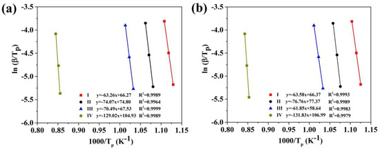 Plots of ln(β/Tp) vs. 1000/Tp for all crystallization stages of (Fe41Co7Cr15Mo14Y2C15B6)100−xCux amorphous alloys; (a) x = 0.25 at.%; (b) x = 0.5 at.%.