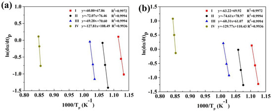 Plots of ln(dα/dt)p vs. 1000/Tp for all crystallization stages of (Fe41Co7Cr15Mo14Y2C15B6)100−xCux amorphous alloys; where x= (a) 0.25 at.%; (b) 0.5 at.%.