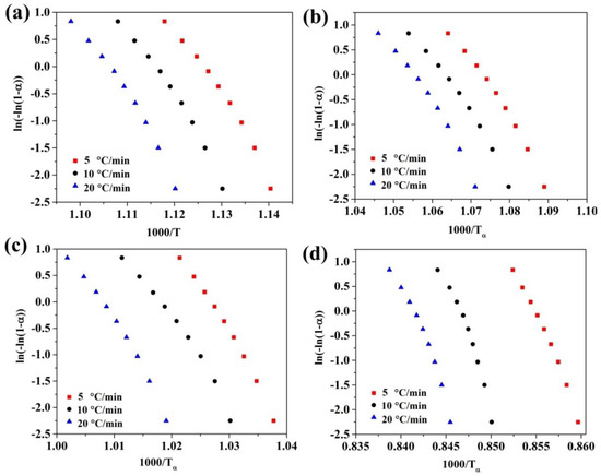 Plots of ln(−ln(1−α)) vs. 1000/Tα for (Fe41Co7Cr15Mo14Y2C15B6)100–0.25Cu0.25BMGs with various heating rates. (a) Peak I; (b) peak II; (c) peak III; (d) peak IV.