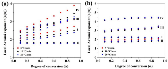 Local Avrami exponent (n(α)) as a function of α for all crystallization stages of (Fe41Co7Cr15Mo14Y2C15B6)100−xCux amorphous alloys; where (a) 0.25 at.%; (b) 0.5 at.%.
