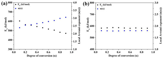 The isoconversional methods are often used to describe their kinetic parameters, evaluate the results of thermal analysis data and provide more insight into the complex reaction mechanism [57,58]. The calculation of activation energy without having to determine the reaction model is one of the advantages of these methods. The activation energy is used to describe the required energy of thermal activation leading to atomic movement [59,60]. As know, the activation energy can be determined in two different ways of local and apparent by using these methods.