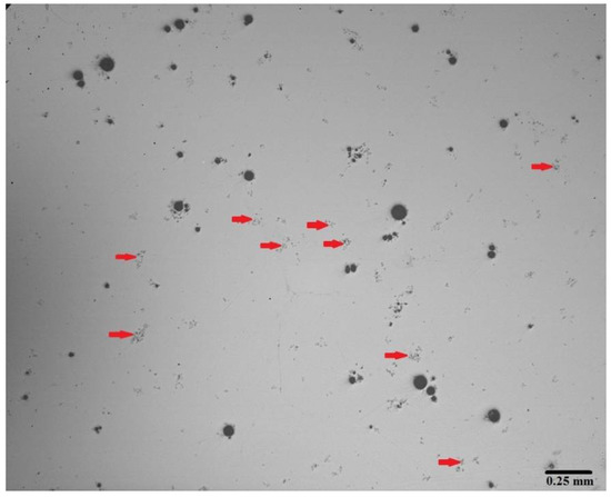 As listed in Table 3, the nucleation rate (b) for the first, second and third crystallization stages are calculated equal to 0 due to the presence of pre-existing clusters. For instance, these pre-existing clusters in the as-cast copper-free BMG are presented in Figure 9. The clusters exist in this sample are shown with red arrows. Also, Figure 10 displays FE-SEM micrographs of the nanocrystalline phases formed in the amorphous matrix of (Fe41Co7Cr15Mo14Y2C15B6)100−xCux(x = 0, 0.25 and 0.5 at.%) alloys annealed at temperature ranges of the first, third and fourth crystallization stages, respectively. As seen in Figure 1a, the plate precipitates are formed in the copper-free amorphous alloy by annealing up to temperature range of the first crystallization peak, which indicates a two-dimensional growth (m = 2). Therefore, microstructural observations confirm the accuracy of the results obtained by kinetic analysis (the Matusita equation). In addition, in Figure 10b,c, the formed spherical precipitates are shown in the BMGs of containing 0.25 at.% and 0.5 at.% copper annealed at the temperature ranges of the third and fourth crystallization peaks, respectively. As listed in Table 3, the growth dimensions for these samples are calculated equal to 3. Therefore, the formation of spherical crystalline precipitates in these samples is expected.