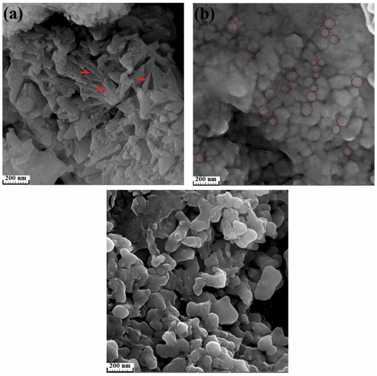 FE-SEM micrographs of the nanocrystalline phases formed in the amorphous matrix of (Fe41Co7Cr15Mo14Y2C15B6)100−xCux. (a) x = 0 at.% annealed up to temperature range of the first crystallization stage; (b) x = 0.25 at.% annealed up to temperature range of the third crystallization stage; (c) x = 0.5 at.% annealed up to temperature range of the fourth crystallization stage.