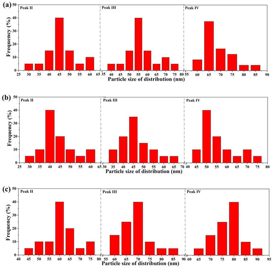 Size distribution of nanocrystallites formed in the specimens of (Fe41Co7Cr15Mo14Y2C15B6)100−xCux BMGs. (a) x = 0 at.%; (b) x = 0.25 at.%; (c) x = 0.5 at.% annealed up to the maximum temperature of the second (II), third (III) and fourth (IV) peaks of crystallization, respectively.