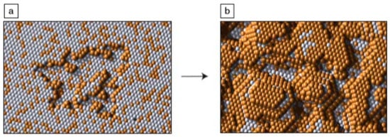 This atomic-scale kinetic Monte Carlo simulation of a dealloying Au-Ag alloy provides a visual model of early porosity evolution during dealloying. (a) When the alloy is exposed to the dealloying medium, Ag atoms begin to dissolve away from the surface. Au atoms accumulate at the step edges via surface diffusion processes. (b) As more Ag atoms are exposed and removed, the steps break up into islands of Au atoms. Eventually, these islands are undercut, and Au atoms nucleate new mounds, forming the nanoporous structure observed in dealloyed materials. Adapted from []. Copyright 2009 by Materials Research Society.