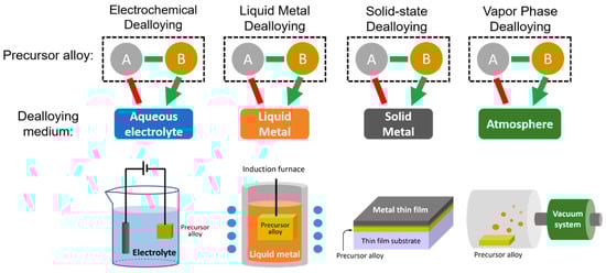 A graphical summary of the four dealloying techniques discussed in the text and the various pathways of dissolution into the four different dealloying mediums.