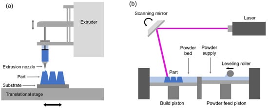 The most promising metal powder bed fusion technique currently is selective laser melting (SLM), in which a high-power laser is used to fuse metal powders together into a solid part []. Inside the build chamber, a thin layer of loose metal powder is swept onto a substrate by a roller, and then the laser selectively melts and fuses areas according to a digital model. The platform is lowered, a new layer of metal powder is swept onto the surface, and the laser scans the next layer of the build. The process is repeated until the component has been fully built. A schematic of a basic SLM setup is given in Figure 4b. Selective laser sintering (SLS) is a similar method where the laser only sinters the loose powder together instead of completely melting the material. However, this method often leads to unfavorable and uncontrolled porosity within the material, negatively impacting the strength of the final manufactured component []. The main advantage of using selective laser melting or sintering is its comparatively wide range of compatible materials, such as Al-based alloys [], Fe-based alloys [], Ti-based alloys [], and metal composites [,], in contrast to other powder bed fusion techniques, such as electron beam melting, which is constrained to a far more limited set of materials than SLM or SLS [].