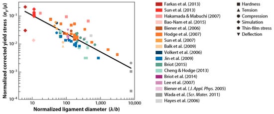 A negative correlation between yield stress and ligament diameter, as shown in these data compiled from various mechanical tests (listed on the right) on nanoporous materials, shows clear evidence of size-dependent strengthening in these materials. Raw yield stress data were corrected to their fully dense yield strength values using their Gibson–Ashby relation and normalized by the material’s shear modulus. Ligament diameter measurements were normalized by the material’s Burgers vector. The black line of best fit gives a power-law exponent very close to power-law values reported for micropillars, which exhibit similar size-strengthening effects. Adapted from []. Copyright 2016 by Annual Reviews.