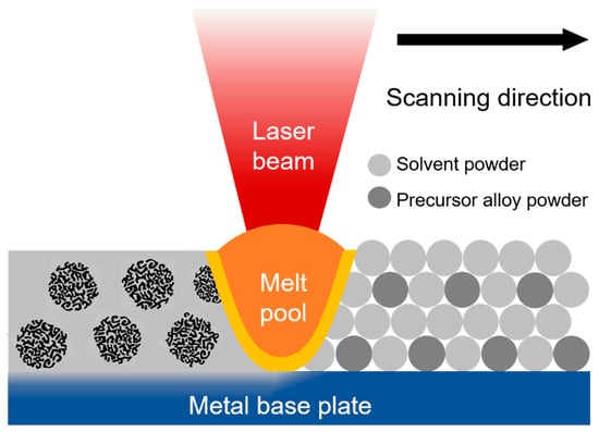 The parameters of the sintering or melting process will be critical for the optimization of simultaneous dealloying and solidification. The scan speed, laser power, and melt pool size and shape are only a few of the factors that can be adjusted to improve the quality of the final sample. Previous studies on the additive manufacturing of metal matrix composites can offer insight into additional issues that may arise when processing powders of two different compositions together. Manfredi et al. reported a case study of manufacturing aluminum matrix composites of AlSiMg alloy with two different types of reinforcements, micro-sized SiC particles and nanosized MgAl2O4 particles []. They measured an increase in hardness in the SiC-reinforced alloys compared to that in pure AlSiMg but observed a loss in mechanical properties in the alloys reinforced with MgAl2O4, which they attributed to changes to the solidification behavior due to the presence of MgAl2O4 nanoparticles. In a similar study, Vrancken et al. studied the microstructure of Ti6Al4V powder mixed with pure Mo particles processed via selective laser melting and found local variations in the content of Mo with bands of Mo-rich and Mo-poor compositions [].