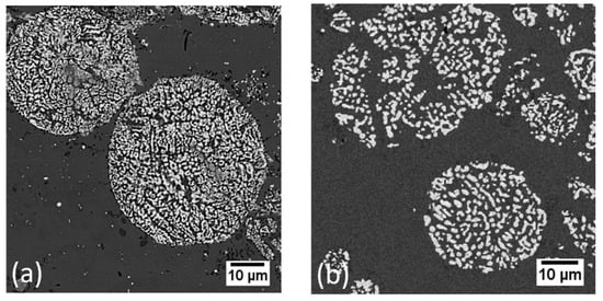 Cross-sectional SEM (scanning electron microscope) images of Ta30Ti70 powder particles dealloyed by surrounding molten copper powder particles. The lighter phases are the remaining parts of the alloy powders—porous networks of Ta-rich ligaments—after Ti has dissolved out into the copper solvent, and the darker phase is the solidified Cu-rich solvent. Here, we show two different pathways for dealloying powders: (a) powders dealloyed by selective laser irradiation, at a scanning speed of 0.75 mm/s, and (b) powders dealloyed by heating a compacted powder disk in an induction furnace for two minutes. The second sample shows significant coarsening due to the longer heating time, compared to the more refined microstructure of the powders dealloyed by the laser, which affected how well the particles retained their original shape.