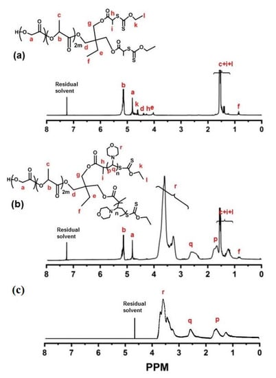 1H NMR spectra of (a) the poly(D,L-lactide-co-glycolide) (PLGA) macroinitiator and PLGA-b-PNAM2 miktoarm-block copolymer (M2) in (b) CDCl3 and (c) D2O at room temperature.