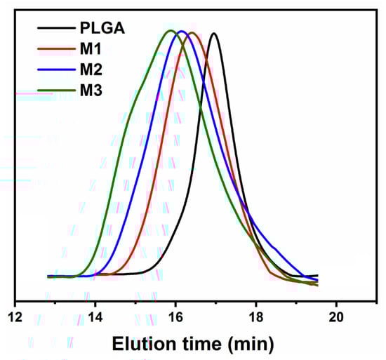 The PLGA-b-PNAM2 miktoarm star block copolymers with different PNAM chain lengths were synthesized by changing the feed ratios of the PLGA macroinitiator to NAM. These miktoarm star block copolymers are denominated M1, M2 and M3. The successful synthesis of the miktoarm star block copolymer was revealed by the 1H NMR spectrum. As shown in Figure 1b, new proton peaks are observed at 2.3–2.8 (q), 3.0–4.0 (r) and 1.70–1.90 (p) ppm, due to the presence of PNAM backbone chains. The GPC chromatogram shows that the elution times of the three miktoarm-block copolymers are shorter than that of the PLGA macroinitiator as can be seen in Figure 2, which indicates the formation of the desired miktoarm-block copolymers. The decrease in the retention time in order of M1, M2 and M3 suggests that the molecular weights of the miktoarm star block copolymers increase as the feed ratios of NAM monomers increase (Table 1) [37].