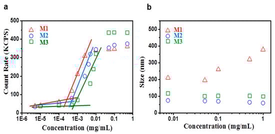 (a) Plot of the counter rate versus the concentration of M1, M2 and M3 in water; (b) plot of the micellar size in diameter versus the concentration of M1, M2 and M3 in water.