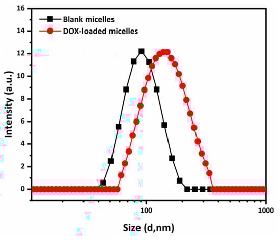 Dynamic light scattering (DLS) study of (a) blank micelles and (b) DOX-loaded micelles of M2.