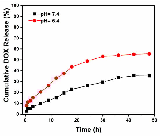 DOX was incorporated into the core of M2 micelles using the dialysis system. The average diameter of the drug-loaded micelles measured to be 71.2 nm by TEM (Figure 4b) and 112.3 nm by DLS (Figure 5). The results revealed that the size of the DOX-loaded M2 micelles was greater than the corresponding blank micelles [22]. The drug-loading efficiency (DLE) and drug-loading content (DLC) of the drug-loaded M2 micelles were calculated to be 81.7% and 9.1%, respectively. The in vitro release of DOX from M2 micelles was evaluated at different pH values (7.4 and 6.4, PBS) under physiological conditions. As shown in Figure 6, the cumulative release of DOX from drug-loaded micelles (M2) was ~35% at pH 7.4 after 48 h. However, the DOX release from the M2 micelles was improved and extended to 56.0% at pH 6.4 after 48 h, which was attributed to the presence of the primary amine group in DOX as expected [43,44]. The primary amine group (pKa = 8.3) of DOX is more protonated at pH 6.4 and thus its solubility in PBS increases, resulting in more favorable release from the polymer micelles. Therefore, the observed increment in DOX release rate at acidic pH (6.4) can be treated as a benefit for an anticancer targeting drug-delivery system.