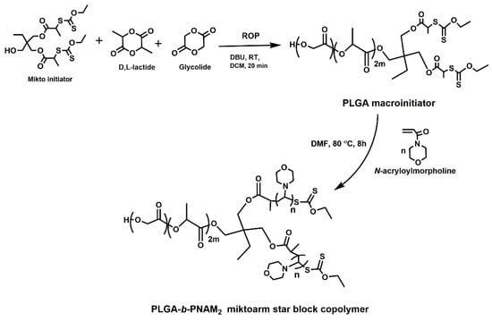 Synthetic scheme for poly(D,L-lactide-co-glycolide)-b-poly(N-acryloyl morpholine) (PLGA-b-PNAM2) miktoarm star block copolymers.