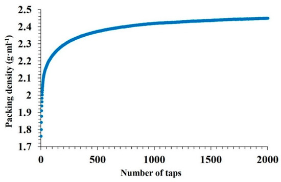 The bulk density of the powders is another important characteristic when choosing the powder feedstock for SLM. Figure 2 shows the packing density of the MoSi2-30 wt.% AlSi10Mg powder mixture. The initial bulk density of the powder was 1.76 ± 0.012g·mL−1; after 2000 taps, the bulk density increased up to 2.45 ± 0.048 g·mL−1 and the packing density was extrapolated to be 2.62 ± 0.064 g·mL−1.