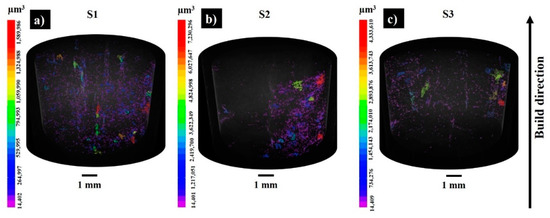 The 3D visualization of the porosity results in as-built samples S1 (a), S2 (b), and S3(c) (pores are labelled by volume (μm3)).
