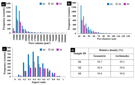 X-ray CT results in as-built samples S1, S2, and S3: pore size distributions (a), pore diameter distributions (b), aspect ratios of the pores (c), and relative geometric and Archimedes density results (d).