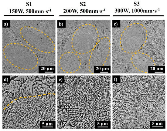 The SEM images of the polished top surfaces of samples S1, S2, and S3 are depicted in Figure 6. The marked elliptical regions in Figure 6a–c demonstrate the core of the melt pools. The solidification process affects the crystallization in different regions due to various temperature gradients and heat flux directions, depending on the laser power and scanning speed. The melt pool dimensions depend on the applied laser power, LED, and temperature. There was a larger heat flux in the center of the melt pool due to Gaussian intensity of the single mode laser beam; hence, the surface tension varied between the center and outer edges, resulting in multifarious microstructures along the sample. Importantly, controlling the volume of the melt by increasing the scan speed was demonstrated to reduce the overlap and cause insufficient melting (Figure 6c).