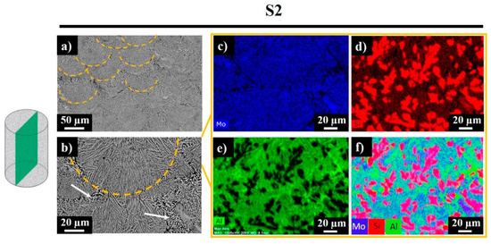 Signals of Mo were recorded everywhere expect the darkest regions, which correspond to the Al-rich phase (Figure 7d, bright green regions). Silicon was also observed in the studied area, while the bright red sections revealed the existence of replaced free Si, where no Al was detected. Accordingly, the sample was composed of Mo-Si-Al-, Al-, Al-, and Si-rich phases. Figure 8 shows the polished side fracture of sample S2 and the corresponding EDS maps. The yellow dashed regions (Figure 8a,b) represent the melt pools. The core of the melt pool was composed of fine elongated columnar dendrites with secondary arms grown parallel to the build direction, whereas the edges consisted of the coarser columnar dendrites (marked with white arrows) with occasional secondary branching due to overlap with the neighboring melt pools (Figure 8b).
