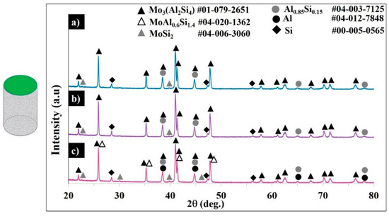 No further chemical reactions were detected. According to the XRD patterns in Figure 10b, the sample contained 62.4% Mo3(Al2Si4), 0.7% MoSi2, 12.4% Si, 3.3% MoAl0.6Si1.4, and 21.2% Al; however, the Al0.85Si0.15 phase was not detected.