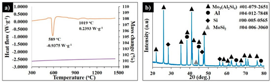To study the mechanism of the MoSi2–AlSi10Mg interaction, the thermogravimetric analysis for MoSi2-30 wt.% AlSi10Mg was performed. Figure 10a shows the DSC-TG curves of the MoSi2-30 wt.% AlSi10Mg mixture heated up to 1450 °C. The DSC curves exhibit the endothermic peak of the reaction of the aluminum melting and the Al-Si eutectic phase formation, where the heat absorption recorded was 0.9575W·g−1. The weak exothermic reaction was observed starting from 944 °C and the maximum heat flow was 0.2393 W·g−1 at 1019 °C.
