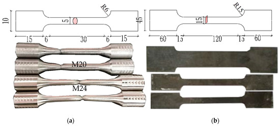 Design dimensions of material test samples (mm): (a) Bolt material test samples; (b) Steel sheet test specimens.