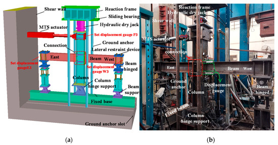 As seen in Figure 6a, 20 strain gauge measuring points are arranged on the end-plates, which are located on the end-plates of the east beam and west beam and are numbered e1–e10 and w1–w10, respectively; as shown in Figure 6b, they are only on the flange and web of the west beam. These plates are equipped with 7 strain gauge measuring points, corresponding to the numbers b1–b7; 11 strain gauge measuring points are arranged on the column web and flange, corresponding to the numbers c1–c11, respectively, for monitoring each component of the joint development of stress. The four claw strain gauge measuring points arranged in the panel zone are used to monitor the shear buckling, which are respectively numbered p1–p4. Bolt pressure sensors are respectively arranged on the two rows of bolts on the end-plate, and the corresponding numbers are S1–S4. Since the edge column joint is only connected to the end-plate by the one-sided column flange, except for the other side’s test device, displacement, and strain measurement points, the rest are the same as the intermediate column joints. The above data signals are collected by the DH-3816N (DongHuaTest, Taizhou, China) static strain measurement system for the strain and displacement of each measuring point. The test load and displacement of the loading point on the beam tip or the top-side of the column are automatically recorded and collected by the inherent built-in force and displacement sensors of the MTS actuator, respectively.