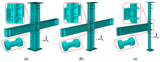 Joint model and mesh of steel part: (a) Full-model mesh; (b) Half-model mesh; (c) Quarter-model mesh.
