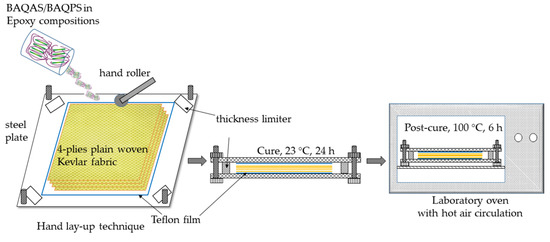 The epoxy compositions containing modified smectic clay were used for the preparation of four-ply Kevlar/epoxy/organoclay composites using the hand lay-up technique (Figure 1). We added 12 wt.% hardener to the mixture, according to the resin manufacturer’s instructions. The epoxy compositions containing amine curing agent were poured on a Teflon film and one dry Kevlar fabric layer was impregnated using a hand roller. Then, another portion of the epoxy composition and dry fabric layer was stacked on it. The stacking procedures were repeated until the desired number of Kevlar fabric plies was laid. The uncured KFCs, after removing the excess of resin, was subsequently degassed for 5 min at room temperature in a laboratory vacuum chamber Vakuum UHG 400, (Schuechl, Bavaria, Germany). Then, the last layer was covered with another Teflon film before the sample was placed between two steel plates of dimensions 200 × 300 mm, which acted as a mold. To control the thickness of the KFCs, four steel plates with the required diameter were placed in the corners between the mold. The laminates (0F4) were left to cure at room temperature for 24 h and then post-cured in an oven with hot air circulation at 100 °C for 6 h. The resulting laminates contained ca. 38% of Kevlar fabric by weight. The samples were cut from the laminates with an oscillating cutting disk. The samples were used to measure the mechanical properties and microscopy analysis.